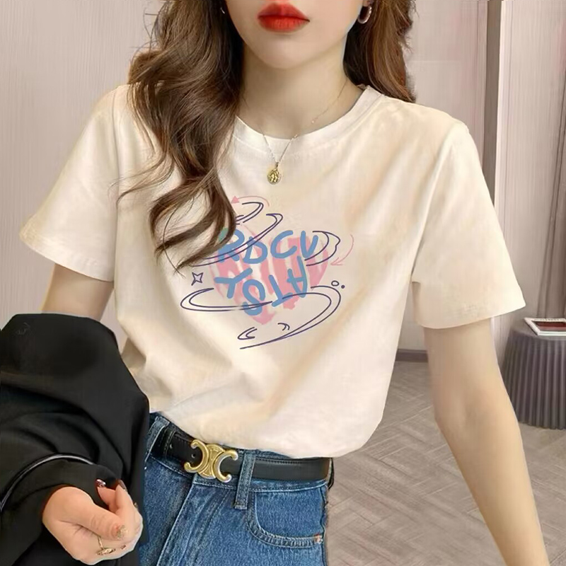 杏色纯棉爱心短袖t恤女2023夏季新款欧货纯棉宽松时尚正肩上衣潮的描述